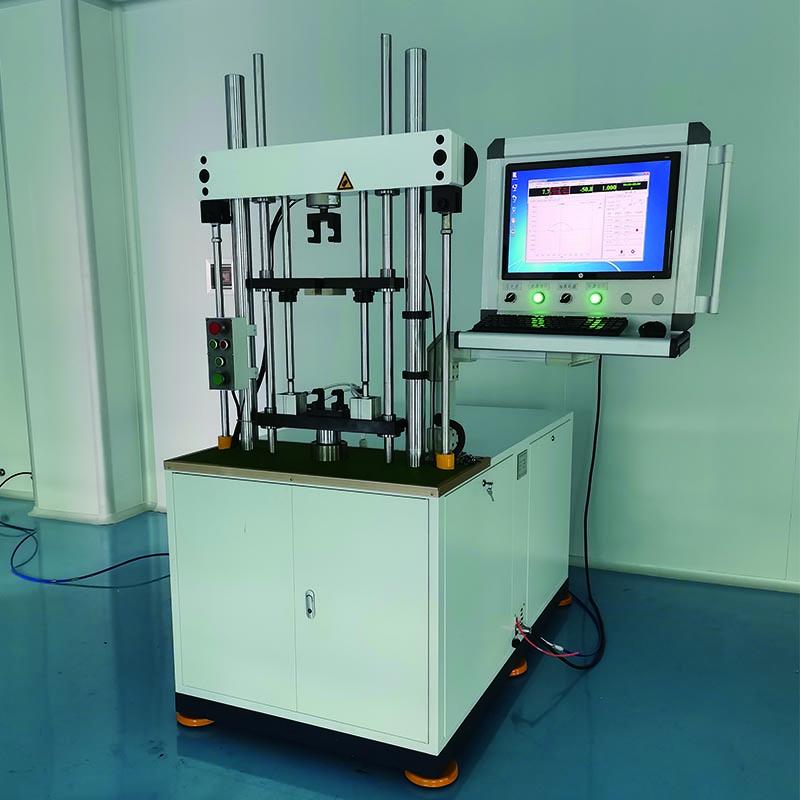 減震器阻尼力檢測(cè)系統(tǒng)產(chǎn)品概述:WPW-30A 微機(jī)控制減震器示功疲勞綜合試驗(yàn)臺(tái)主要用于對(duì)各種汽車、空氣懸掛氣囊減震 器、改裝車、SUV、裝甲車、輕卡、重卡、沙灘車等減震器及各種汽車等機(jī)動(dòng)車所使用的減振 器進(jìn)行示功試驗(yàn)、線速度試驗(yàn)、疲勞壽命試驗(yàn)等。也可制作特種夾具,以適應(yīng)特殊試樣的疲勞 試驗(yàn)。 減震器阻尼力檢測(cè)系統(tǒng)設(shè)備結(jié)構(gòu)的描述 該機(jī)為單工位操作,整體為立式雙柱式結(jié)構(gòu),由機(jī)座、上橫梁及升降機(jī)構(gòu)、阻尼力檢測(cè) 系統(tǒng)、驅(qū)動(dòng)機(jī)構(gòu)、減振器缸筒壓緊機(jī)構(gòu)、示功及疲勞工裝、液壓系統(tǒng)、采集卡、計(jì)算機(jī)、工 控軟件及電控系統(tǒng)、快插接頭可選等組成。 1、機(jī)座:采用工業(yè)級(jí)槽鋼和鋼板焊機(jī)而成長(zhǎng)方形框架,焊道均勻美觀。具備足夠的強(qiáng)度及剛 度,為了保證操作安全。 2、上橫梁及升降機(jī)構(gòu):由橫梁、兩橫梁導(dǎo)向立柱、兩升降液壓缸、橫梁鎖緊機(jī)構(gòu)、液壓等組 成。液壓缸驅(qū)動(dòng)橫梁上下移動(dòng)并在停位位置液壓自動(dòng)鎖緊,從而控制設(shè)備的安裝高度,使測(cè) 試行程位于減振器行程中段。 3、活塞桿頂緊及回拉機(jī)構(gòu):由液壓缸、導(dǎo)向及連接機(jī)構(gòu)、力傳感器及夾具等組成,實(shí)現(xiàn)活塞 桿夾緊后回拉到工作位置。 4、阻尼力檢測(cè)系統(tǒng):由力傳感器和手動(dòng)裝夾裝置等組成。力傳感器用于對(duì)工件運(yùn)動(dòng)過(guò)程中的 拉伸及壓縮力值進(jìn)行實(shí)時(shí)監(jiān)測(cè)。 5、驅(qū)動(dòng)機(jī)構(gòu):由伺服電機(jī)、減速機(jī)、齒形帶、齒形帶輪、軸承座、主軸、曲柄、滑塊及導(dǎo)向 裝置等組成。電機(jī)減速機(jī)為運(yùn)動(dòng)部分提供動(dòng)力。通過(guò)齒形帶和主軸的傳動(dòng),將動(dòng)力傳遞到曲 柄滑塊機(jī)構(gòu),用以實(shí)現(xiàn)帶動(dòng)工件按正弦運(yùn)動(dòng)。 6、減振器缸筒壓緊機(jī)構(gòu):由位移傳感器、壓緊油缸、上壓緊板、導(dǎo)柱、底座等組成。由油缸 驅(qū)動(dòng)上壓板上下滑動(dòng),實(shí)現(xiàn)對(duì)減振器缸筒的壓緊。通過(guò)位移傳感器監(jiān)控導(dǎo)向器壓裝行程是否 到位。 7、示功工裝:由減振器吊環(huán)快速夾緊工裝及減振器缸筒壓緊工裝組成,工裝采用快換結(jié)構(gòu)。 上吊環(huán)采用通用結(jié)構(gòu),手工放入后,采用機(jī)械式加緊兩種。 8、液壓系統(tǒng):由油箱、單向閥、換向閥、調(diào)壓閥、電機(jī)、油泵、空氣濾請(qǐng)器等組成,為工件 夾緊及上橫梁升降提供動(dòng)力。液壓系統(tǒng)的導(dǎo)向器頂緊油缸及吊環(huán)頂緊油缸的油路分別加調(diào)壓 閥、壓力表來(lái)控制及顯示油路壓力。 9、采集卡:用于力及位移信號(hào)的采集與轉(zhuǎn)化。 10、計(jì)算機(jī)(采用 XP 系統(tǒng)):用于對(duì)采集卡采集信號(hào)的接收,并通過(guò)安裝的工控軟件進(jìn)行運(yùn)算、 分析、繪制 P-S 圖和 P-V 圖,顯示最大拉伸及壓縮阻尼力,設(shè)置、上下限,不合格屏顯報(bào)警 并加裝紅綠燈顯示。 11、電氣控制系統(tǒng):由伺服電機(jī)驅(qū)動(dòng)器、電氣元件、電氣回路及電控箱等組.成。設(shè)有手動(dòng)及自動(dòng)兩種操作模式,設(shè)備增加原點(diǎn)開關(guān),保證一鍵復(fù)位。 減震器阻尼力檢測(cè)系統(tǒng)功能和特點(diǎn): 1) 系統(tǒng)設(shè)置保存功能:測(cè)試系統(tǒng)可對(duì)力和速度的設(shè)置進(jìn)行保存; 2) 自檢功能:可對(duì)設(shè)備自檢,查看設(shè)備是否正常; 3) 運(yùn)行調(diào)整功能:將位移傳感器殼體上移或下移,對(duì)位移傳感器校零; 4) 傳感器標(biāo)定功能:可對(duì)力傳感器、位移傳感器和速度進(jìn)行標(biāo)定。 5) 力傳感器清零功能:力傳感器下端安裝夾具更換時(shí),且每天第一次試驗(yàn)區(qū)前都需要力傳 感器清零; 6) 單工況測(cè)試功能:可對(duì)減振器進(jìn)行單工況測(cè)試,可手動(dòng)測(cè)試也可自動(dòng)測(cè)試,實(shí)驗(yàn)完成后, 可將實(shí)驗(yàn)數(shù)據(jù)保存、讀取和打印。 7) 多工況測(cè)試功能:可對(duì)減振器進(jìn)行多工況測(cè)試,可手動(dòng)測(cè)試也可自動(dòng)測(cè)試,實(shí)驗(yàn)完成后, 可將實(shí)驗(yàn)數(shù)據(jù)保存、讀取和打印。 8) 計(jì)數(shù)功能:可對(duì)每 24 小時(shí)所試驗(yàn)的減振器數(shù)量(包括合格品數(shù)量和不合格品數(shù)量),并 可保存、讀取、打印。 9) 示功結(jié)果可生成報(bào)告(包括數(shù)據(jù)、圖形),數(shù)據(jù)以 Excle 文件存儲(chǔ)。 10) 疲勞試驗(yàn)(可以根據(jù)實(shí)驗(yàn)要求,做破壞性試驗(yàn)。能達(dá)到預(yù)設(shè)次數(shù)停機(jī)功能、力值衰減曲 線、峰值檢測(cè)等) 11) 電感測(cè)試:在同一速度要求下,可以給定不同的電流或電壓來(lái)測(cè)試復(fù)原和壓縮阻力. 減震器阻尼力檢測(cè)系統(tǒng)設(shè)備的技術(shù)參數(shù): 1、最大力值:30000N 2、速度:可在 0.01~0.52m/s 之間可調(diào),電機(jī)為伺服電機(jī),精度更高,通過(guò)控制器可隨意設(shè)置 所需的速度,也可設(shè)置快捷件,達(dá)到常用速