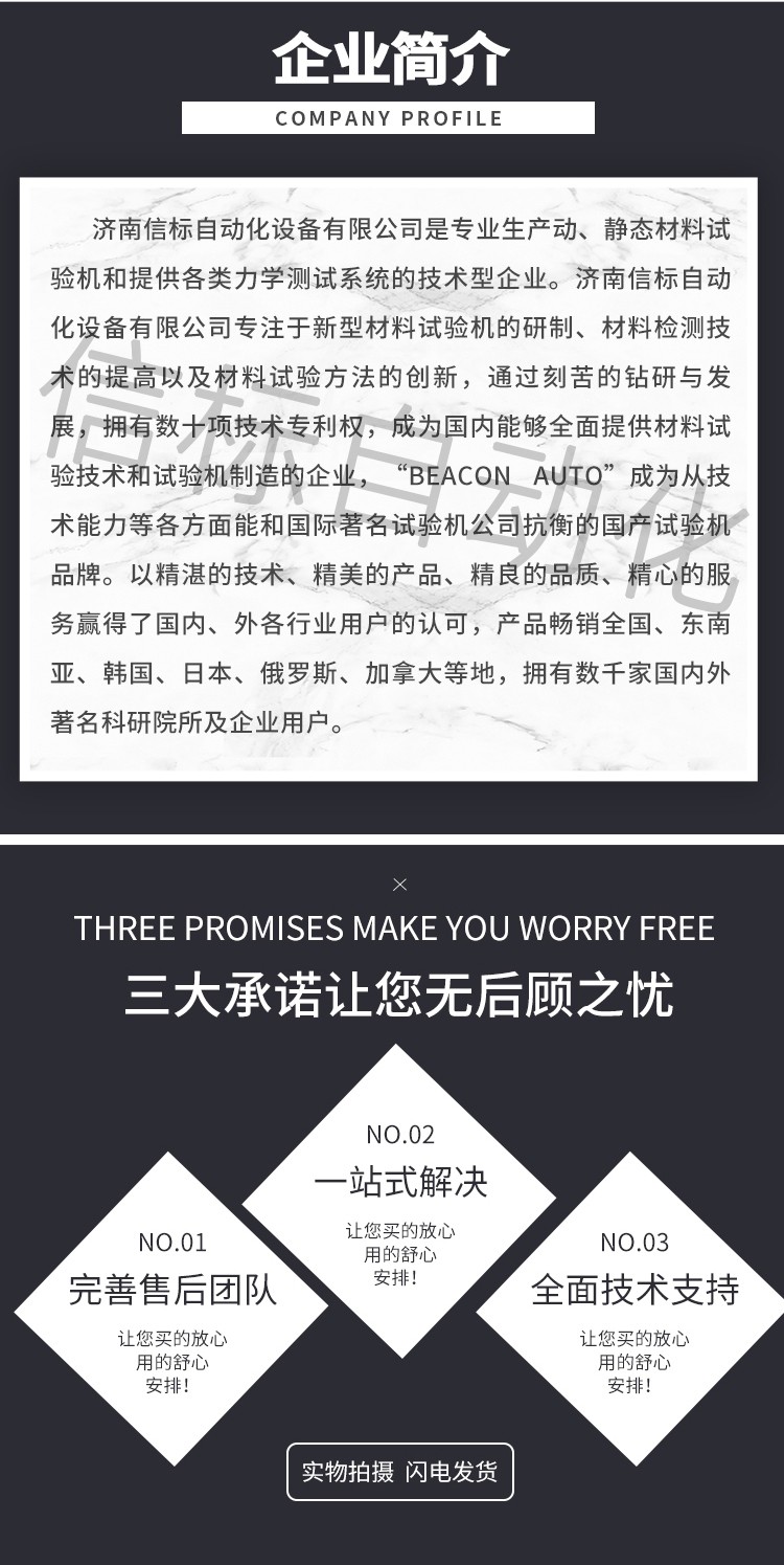 濟南信標自動化設備有限公司主要生產:動靜態萬能疲勞試驗機,接骨板彎曲試驗機,縫合線拉伸疲勞試驗機,髖膝關節磨損試驗機,電子萬能試驗機、液壓萬能試驗機、巖石三軸、四軸,電液拉力試驗機,材料試驗機,高低溫蠕變,高低頻疲勞,拉伸、扭轉、杯突等二十多個系列兩千多個的品種。