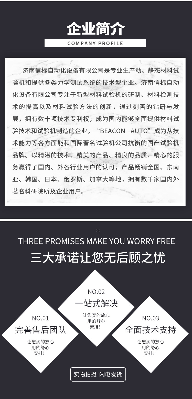 濟南信標(biāo)自動化設(shè)備有限公司主要生產(chǎn):動靜態(tài)萬能疲勞試驗機,接骨板彎曲試驗機,縫合線拉伸疲勞試驗機,髖膝關(guān)節(jié)磨損試驗機,電子萬能試驗機、液壓萬能試驗機、巖石三軸、四軸,電液拉力試驗機,材料試驗機,高低溫蠕變,高低頻疲勞,拉伸、扭轉(zhuǎn)、杯突等二十多個系列兩千多個的品種。