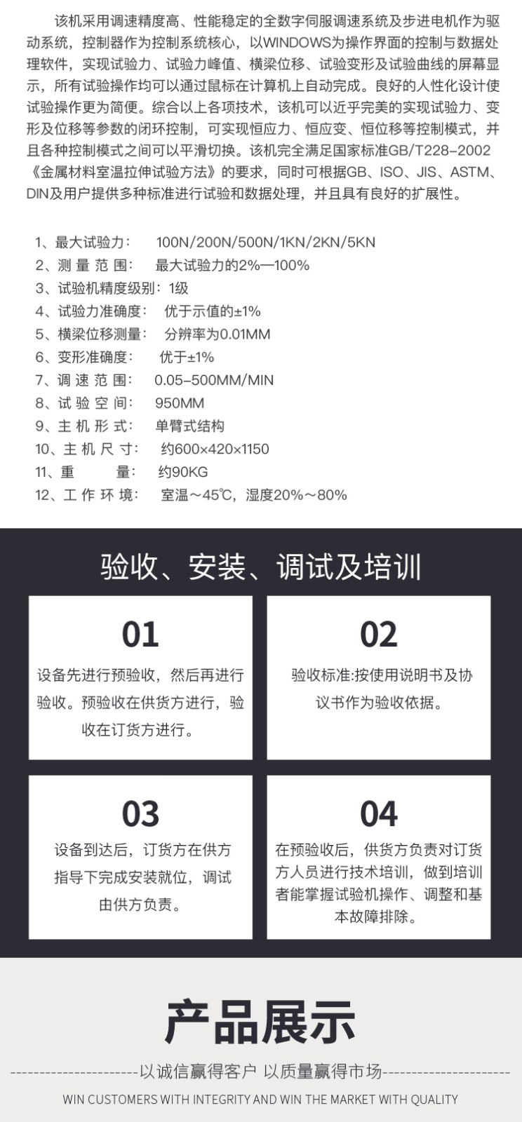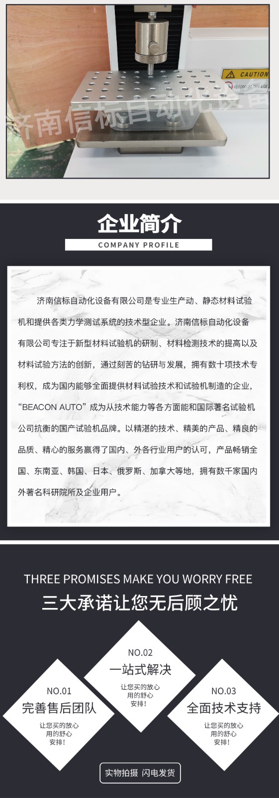 飯盒壓縮抗壓試驗(yàn)機(jī) 單臂壓力萬(wàn)能試驗(yàn)機(jī)主要技術(shù)指標(biāo): 1、 最大試驗(yàn)力: 100N/200N/500N/1KN/2KN/5KN 2、 測(cè) 量 范 圍: 最大試驗(yàn)力的2%—100% 3、 試驗(yàn)機(jī)精度級(jí)別:1級(jí) 4、 試驗(yàn)力準(zhǔn)確度: 優(yōu)于示值的±1% 5、 橫梁位移測(cè)量: 分辨率為0.01mm 6、 變形準(zhǔn)確度: 優(yōu)于±1% 7、 調(diào) 速 范 圍: 0.05-500mm/min 8、 試 驗(yàn) 空 間: 950mm 9、 主 機(jī) 形 式: 單臂式結(jié)構(gòu) 10、 主 機(jī) 尺 寸: 約600×420×1150 11、 重 量: 約90Kg 12、 工 作 環(huán) 境: 室溫~45℃,濕度20%~80% 飯盒壓縮抗壓試驗(yàn)機(jī) 單臂壓力萬(wàn)能試驗(yàn)機(jī)主要功能及特點(diǎn): 主機(jī): 1.1調(diào)速系統(tǒng)采用伺服電機(jī)和自主研發(fā)減速系統(tǒng),性能穩(wěn)定可靠,具有過(guò)流、過(guò)壓、過(guò)載等保護(hù)裝置。調(diào)速范圍可達(dá)0.05~500mm/min。 1.2傳動(dòng)部分采用圓弧同步齒形帶,精密絲杠副傳動(dòng),傳動(dòng)平穩(wěn),噪音低,傳動(dòng)效率高。 1.3萬(wàn)向節(jié)采用十字插銷結(jié)構(gòu),而且具有擺角限制功能,一方面便于試樣夾持,保證試驗(yàn)同心度,另一方面很好的消除了不規(guī)則試樣對(duì)傳感器的影響。 2、控制系統(tǒng)、操作軟件及數(shù)據(jù)處理系統(tǒng) 2.1計(jì)算機(jī)控制系統(tǒng),具有集成度高、性能穩(wěn)定、調(diào)整方便等優(yōu)點(diǎn)。可以對(duì)實(shí)驗(yàn)數(shù)據(jù)進(jìn)行實(shí)時(shí)采集,對(duì)實(shí)驗(yàn)特性曲線實(shí)現(xiàn)實(shí)時(shí)動(dòng)態(tài)顯示,試驗(yàn)數(shù)據(jù)文件能以Access常用數(shù)據(jù)庫(kù)或SQLserve大型數(shù)據(jù)庫(kù)的方式保存,方便實(shí)現(xiàn)客戶的資源共享及網(wǎng)絡(luò)管理,以及用戶的再分析。對(duì)于用戶自定義的各種word2000報(bào)表,該軟件可輕松實(shí)現(xiàn)訪問(wèn),解決了不同用戶或同一用戶在不同時(shí)期對(duì)試驗(yàn)報(bào)表有不同需要的難題。該軟件可處理試驗(yàn)力、位移、 時(shí)間、變形的原始數(shù)據(jù)及由此派生的曲線。