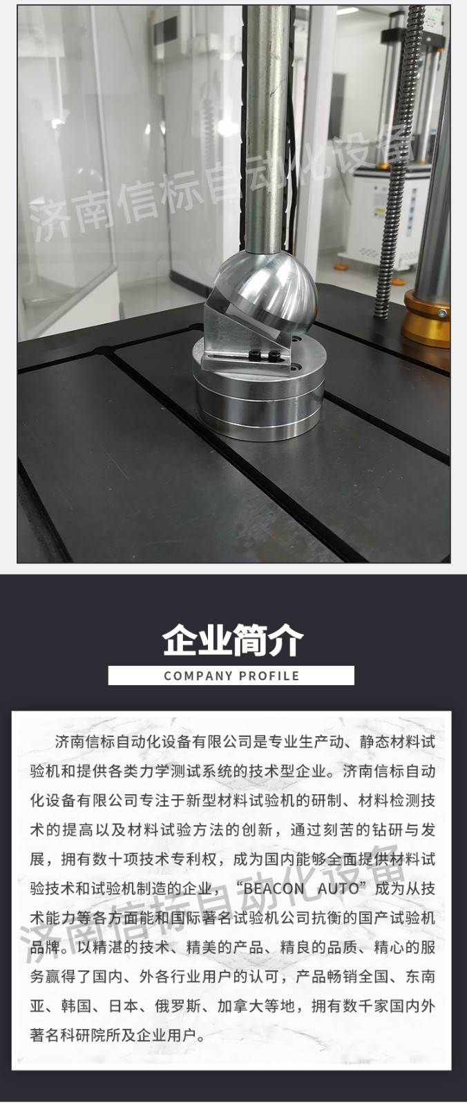 濟南信標自動化設備有限公司主要生產:動靜態萬能疲勞試驗機,接骨板彎曲試驗機,縫合線拉伸疲勞試驗機,髖膝關節磨損試驗機,電子萬能試驗機、液壓萬能試驗機、巖石三軸、四軸,電液拉力試驗機,材料試驗機,高低溫蠕變,高低頻疲勞,拉伸、扭轉、杯突等二十多個系列兩千多個的品種。