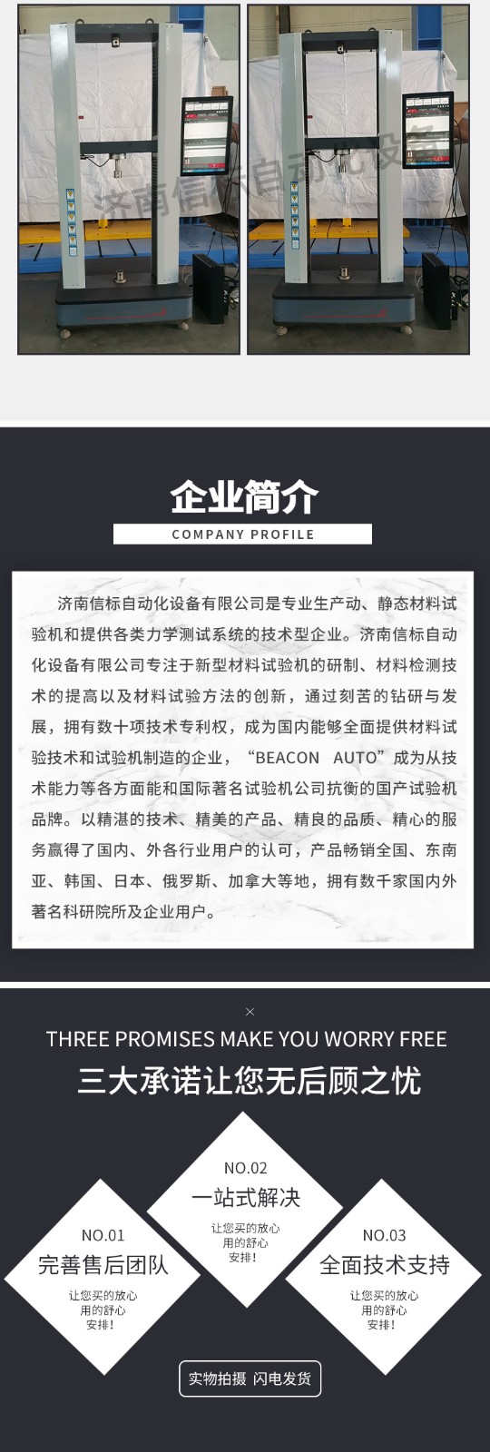 濟南信標自動化設備有限公司主要生產:動靜態萬能疲勞試驗機,接骨板彎曲試驗機,縫合線拉伸疲勞試驗機,髖膝關節磨損試驗機,電子萬能試驗機、液壓萬能試驗機、巖石三軸、四軸,電液拉力試驗機,材料試驗機,高低溫蠕變,高低頻疲勞,拉伸、扭轉、杯突等二十多個系列兩千多個的品種。