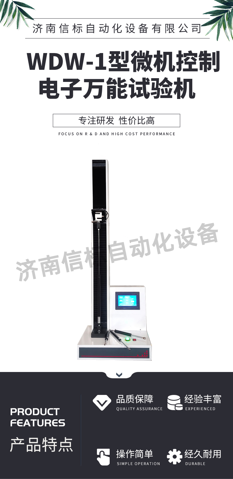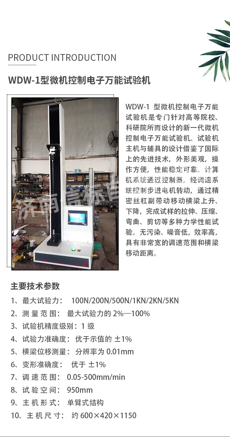 當前位置:首頁 > 產品中心 > 微機控制電子萬能試驗機 > WDW-1微機控制數顯電子萬能試驗機(單臂拉力剝離強度)