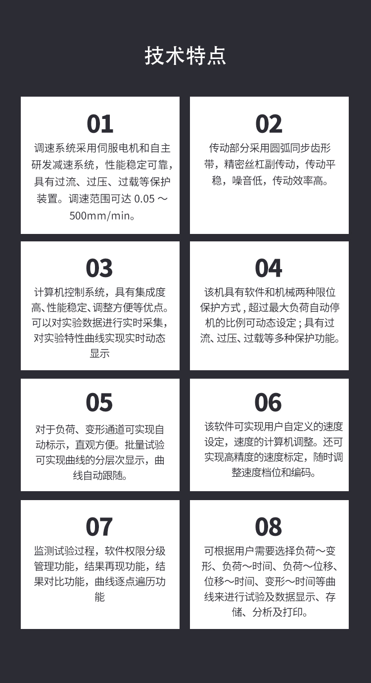 該機采用調速精度高、性能穩定的全數字伺服調速系統及步進電機作為驅動系統,控制器作為控制系統核心,以WINDOWS為操作界面的控制與數據處理軟件,實現試驗力、試驗力峰值、橫梁位移、試驗變形及試驗曲線的屏幕顯示,所有試驗操作均可以通過鼠標在計算機上自動完成。良好的人性化設計使試驗操作更為簡便。綜合以上各項技術,該機可以近乎完美的實現試驗力、變形及位移等參數的閉環控制,可實現恒應力、恒應變、恒位移等控制模式,并且各種控制模式之間可以平滑切換。該機完全滿足國家標準GB/T228-2002《金屬材料室溫拉伸試驗方法》的要求,同